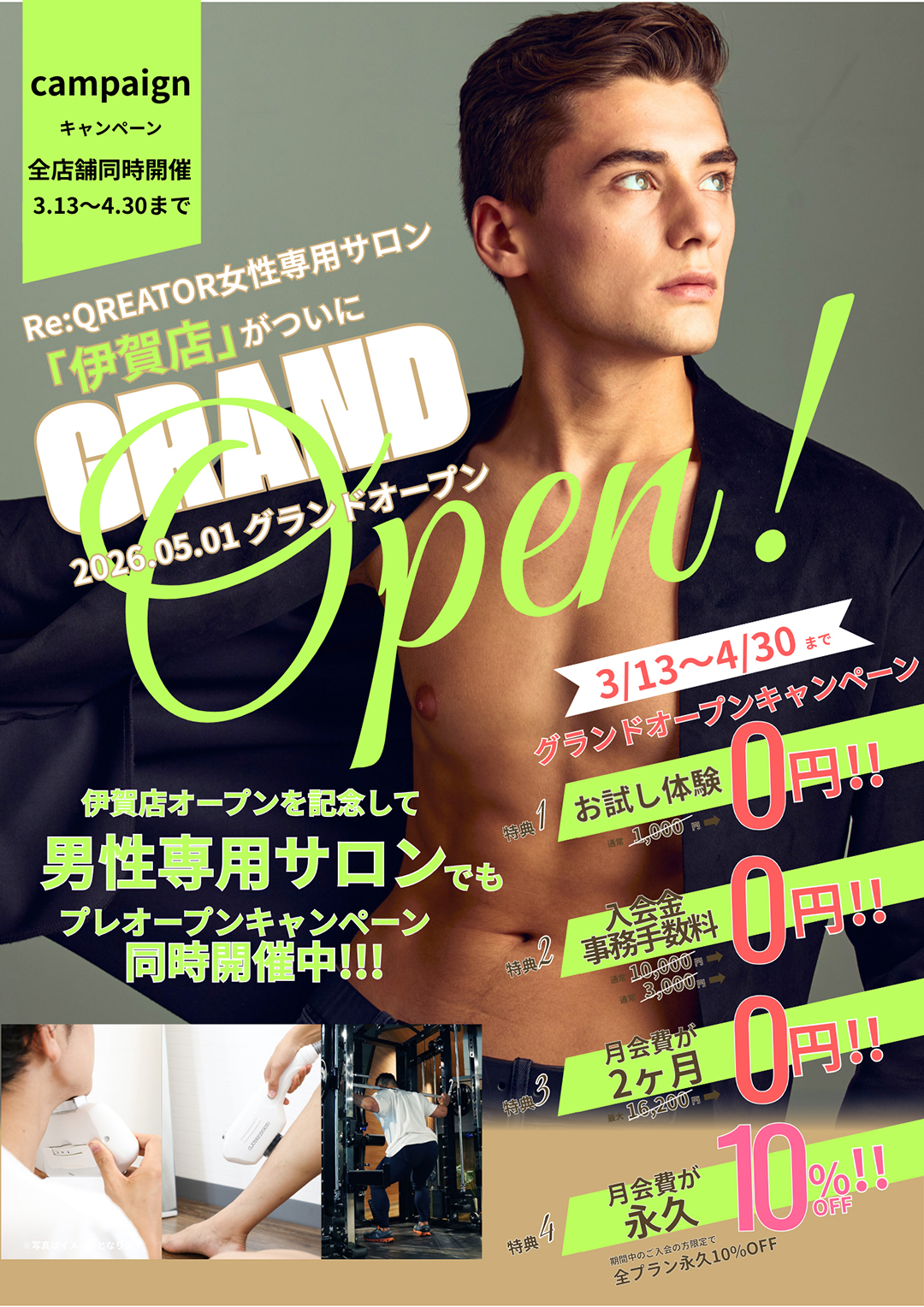 ※フィットネスは「Re:QREATOR 男性専用セルフサロン伊賀店」のみご利用頂けます