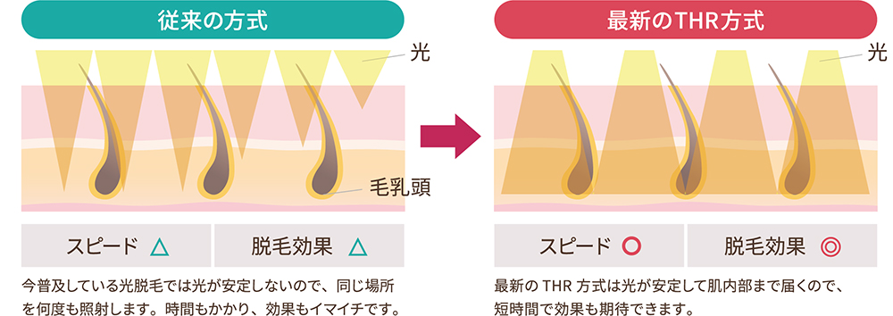 THR方式とは近年の光脱毛のなかでも「次世代の蓄熱式脱毛」として注目を集めています。赤外線領域を含む波長の光を照射し、毛を生やす指令を出す組織である「バルジ領域」にダメージを与えることで脱毛を促す仕組みです。